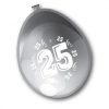 Ballonnen in de kleur metallic zilver bedrukt met de leeftijd 25. Deze ballonnen zitten per 6 stuks verpakt in een headerbag.