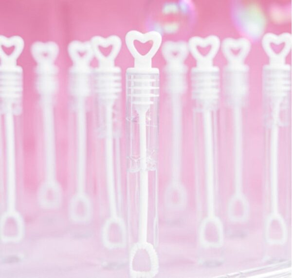 Kinderen vinden het leuk, volwassenen stiekem ook. Je kunt ze tevens gebruiken als bedankje! Lintje met een kaartje eraan, mooi opgemaakt in een mandje met wat tule of wit satijn, helemaal klaar! Een staafje is ongeveer 11 cm lang met aan de bovenkant een witte schroefdop met een hartje er bovenop. Aan deze schroefdop zit een staafje met een gaatje er aan waar je de bellen door blaast. Het ziet er fantastisch uit! (zowel op de dag van de bruiloft zelf, als op de foto’s) Uiteraard zijn de harten staafjes ook al gevuld met vloeistof.