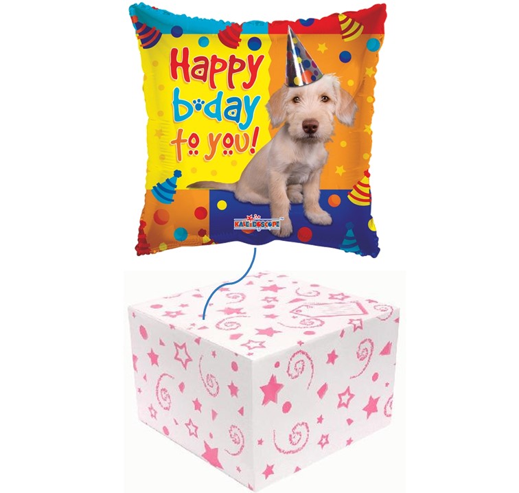 Folie ballon Happy Birthday hond helium gevuld in mooie doos. – 25cm x 37cm x 37cm.