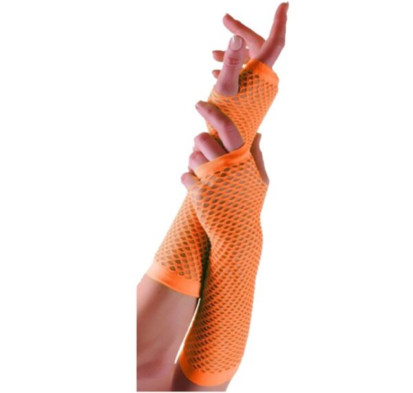 Lange net handschoenen vingerloos fluor oranje voor carnaval, koningsdag of themafeest.