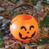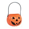 Oranje emmer in de vorm van een pompoen. De emmer heeft een grootte van 14x17cm en is perfect voor Halloween!