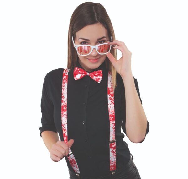 Bestel de Set bloedlust 3 delig – bril, strik en bretel – Halloween bij J-Martens. Complete accessoires voor een griezelige Halloween look, perfect voor feesten, verkleedpartijen en kostuumwedstrijden.